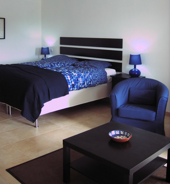 Furnished in blue colours, this bedroom has a fresh, cool atmosphere.